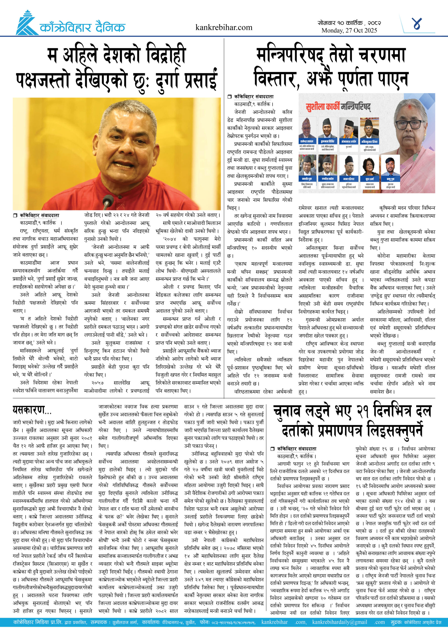 काँक्रेविहार दैनिकः साेमवार ९ कार्तिक २०८२, 27 Oct 2025