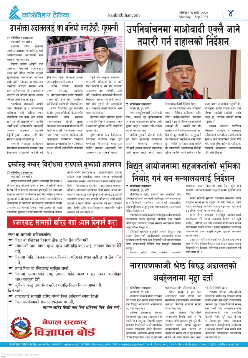 काँक्रेविहार दैनिकः सोमवार १६ भदौ २०८२, 1 Sep 2025
