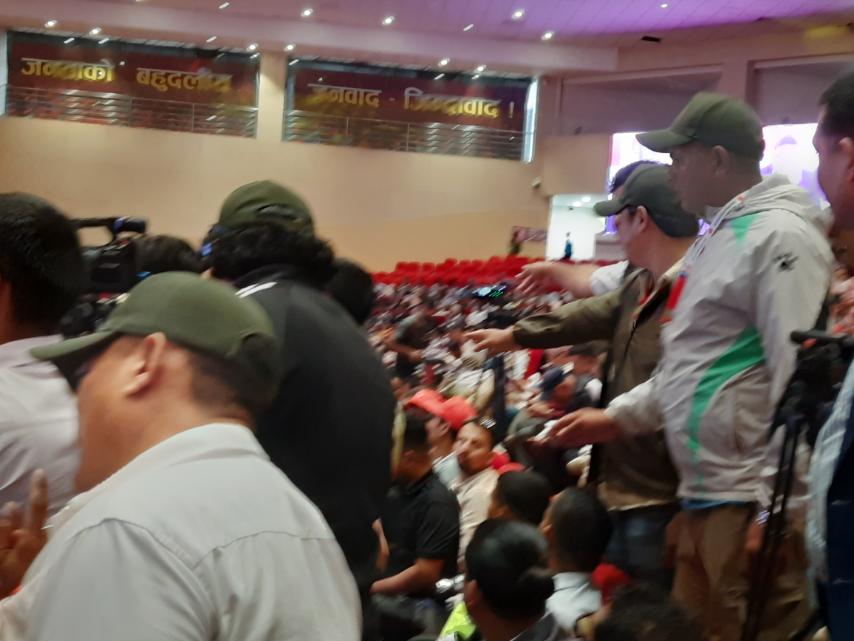 महाधिवेशनमा पार्टी अध्यक्ष केपी शर्मा ओलीले प्रतिवेदन पेस गरिरहँदा हलमा उपस्थित पत्रकारहरूलाई बाहिर निस्कन भनिएको छ ।