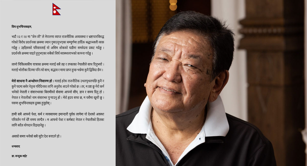 उनले भनेका छन्, ‘मलाई हरेक राजनीतिक उथलपुथलपछि कुनै न कुनै पदमा बसेर नेतृत्व गरिदिनका लागि अनुराेध आउने गरेकाे छ । तर, म प्रस्ट छु मेराे कर्म भनेकाे नेपाली र संसारभरका बिरामीकाे सेवामा आफ्नाे सीप, ज्ञान र समय दिनु हाे । ‘ उनले सबैले आ-आफ्नाे पेशा, कर्म र व्यवसायमा इमान्दारीपूर्वक लागे देशकाे अवस्था परिवर्तन गर्न समय नलाग्ने समेत बताएका छन् ।