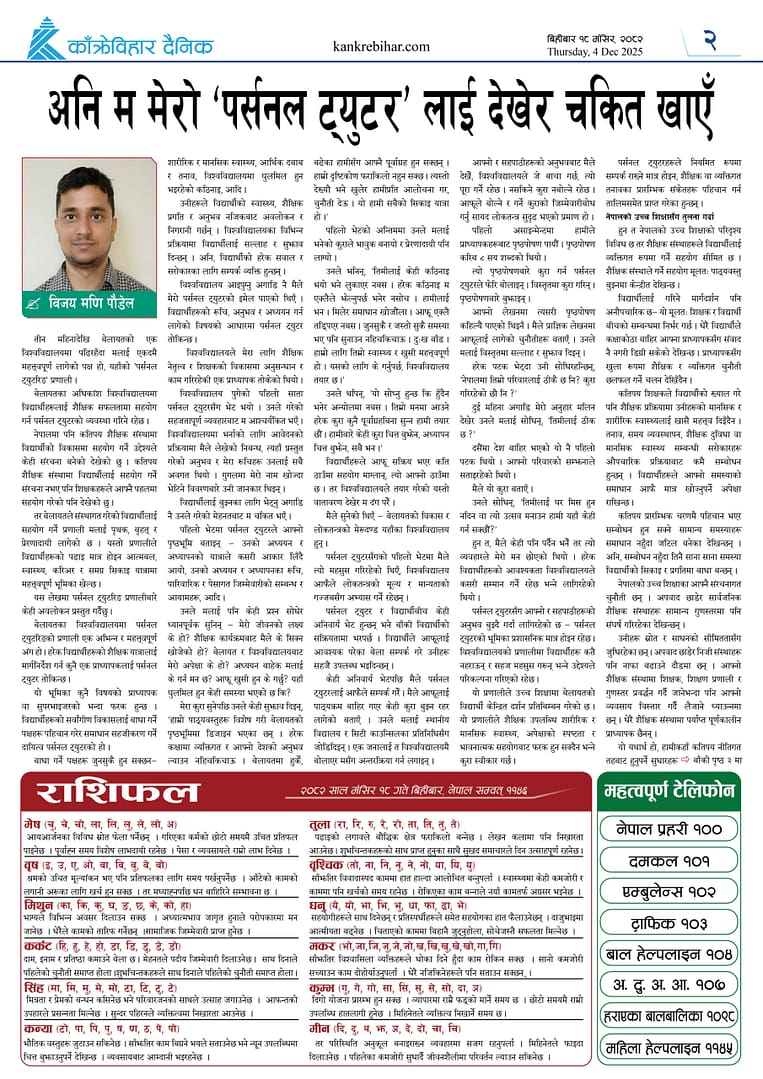 काँक्रेविहार दैनिकःबिहीबार ३ पुष २०८२, 18 Dec 2025