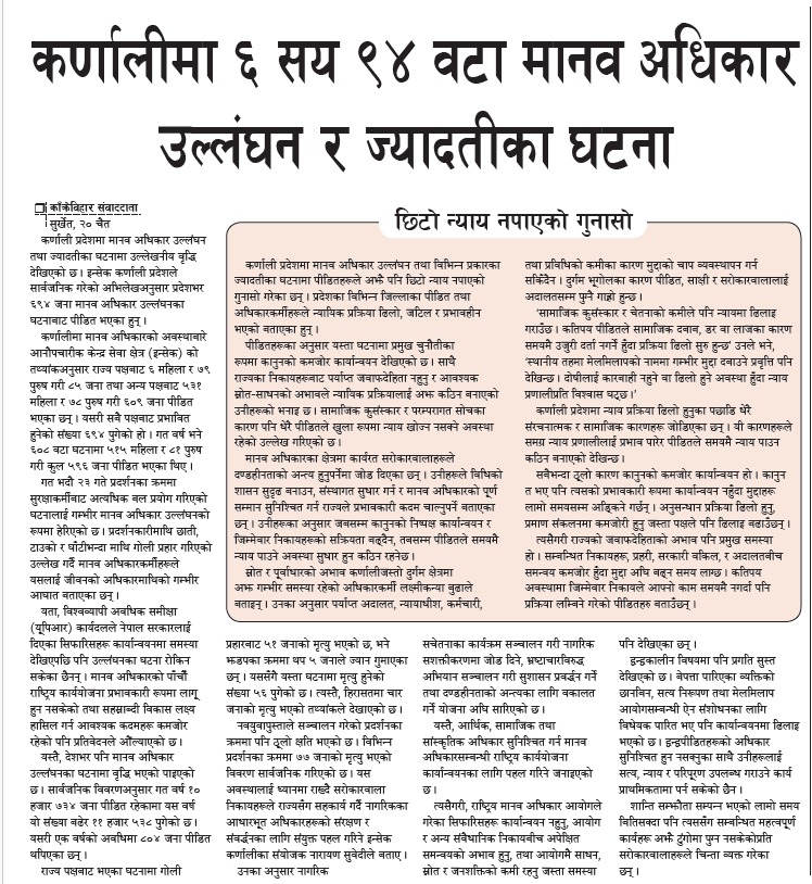 कर्णाली प्रदेशमा मानव अधिकार उल्लंघन तथा विभिन्न प्रकारका ज्यादतीका घटनामा पीडितहरूले अझै पनि छिटो न्याय नपाएको गुनासो गरेका छन् । प्रदेशका विभिन्न जिल्लाका पीडित तथा अधिकारकर्मीहरूले न्यायिक प्रक्रिया ढिलो, जटिल र प्रभावहीन भएको बताएका हुन् ।