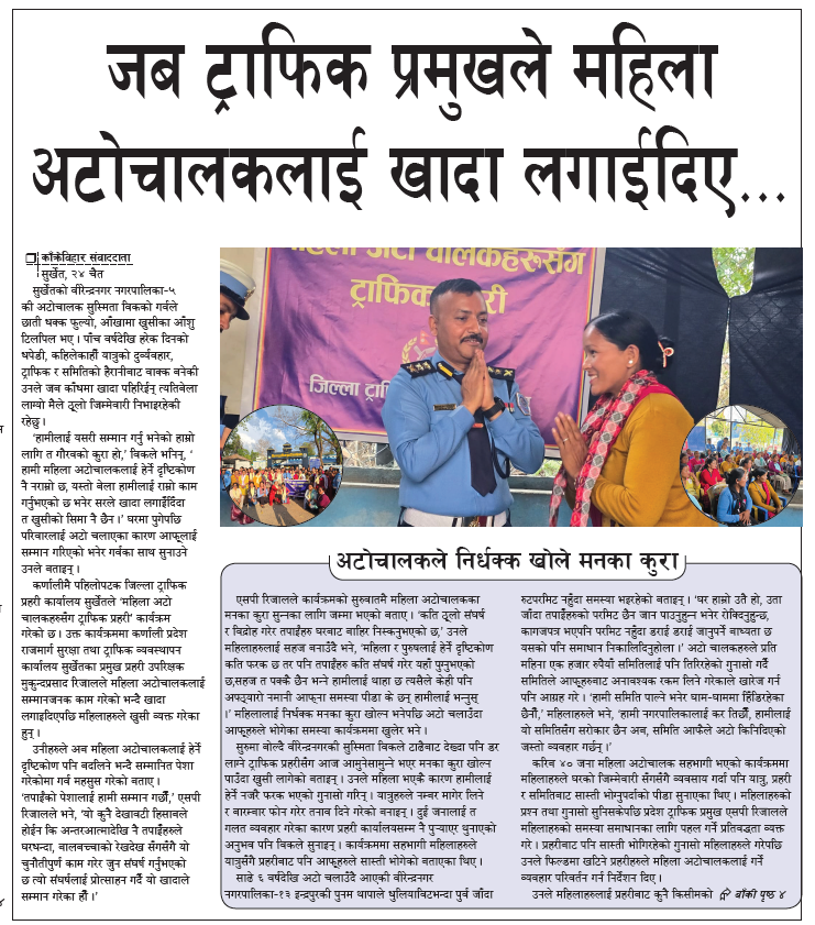कर्णालीमै पहिलोपटक जिल्ला ट्राफिक प्रहरी कार्यालय सुर्खेतले ‘महिला अटो चालकहरुसँग ट्राफिक प्रहरी’ कार्यक्रम गरेको छ । उक्त कार्यक्रममा कर्णाली प्रदेश राजमार्ग सुरक्षा तथा ट्राफिक व्यवस्थापन कार्यालय सुर्खेतका प्रमुख प्रहरी उपरिक्षक मुकुन्दप्रसाद रिजालले महिला अटोचालकलाई सम्मानजनक काम गरेको भन्दै खादा लगाइदिएपछि महिलाहरुले खुसी व्यक्त गरेका हुन् । उनीहरुले अब महिला अटोचालकलाई हेर्ने दृष्टिकोण पनि बदलिने भन्दै सम्मानित पेशा गरेकोमा गर्व महसुस गरेको बताए । ‘तपाईंको पेशालाई हामी सम्मान गर्छौँ,’ एसपी रिजालले भने, ‘यो कुनै देखावटी हिसाबले होईन कि अन्तरआत्मादेखि नै तपाईँहरुले घरधन्दा, बालबच्चाको रेखदेख सँगसँगै यो चुनौतीपुर्ण काम गरेर जुन संघर्ष गर्नुभएको छ त्यो संघर्षलाई प्रोत्साहन गर्दै यो खादाले सम्मान गरेका हौँ ।’