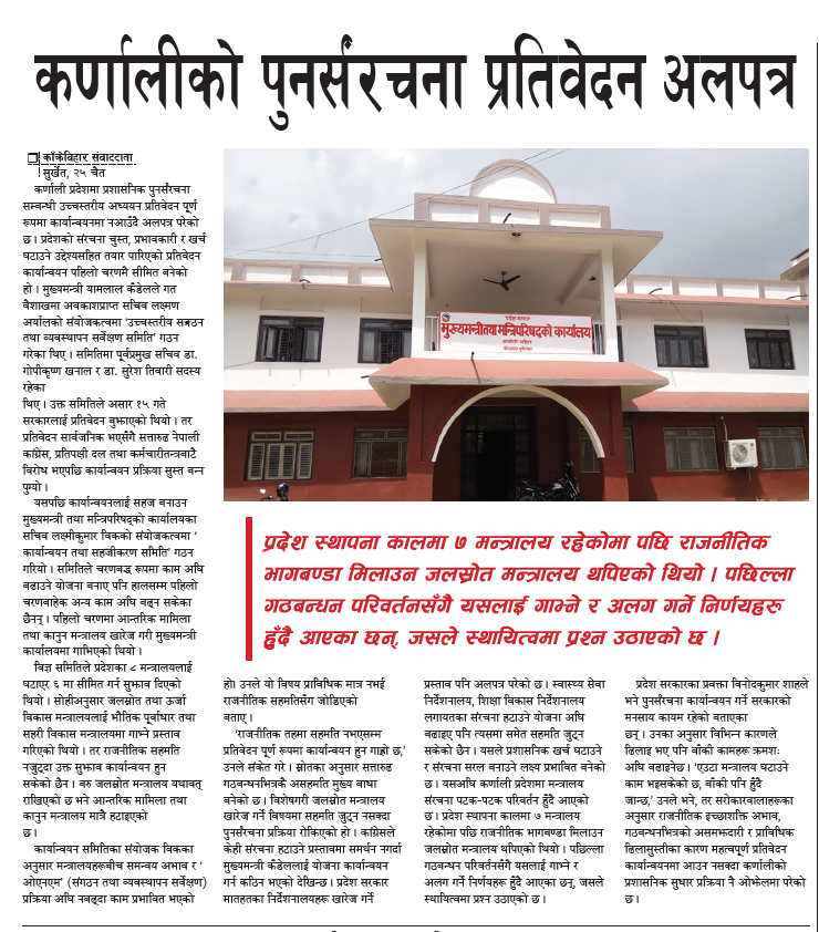 सुर्खेत । कर्णाली प्रदेशमा प्रशासनिक पुनर्संरचना सम्बन्धी उच्चस्तरीय अध्ययन प्रतिवेदन पूर्ण रूपमा कार्यान्वयनमा नआउँदै अलपत्र परेको छ । प्रदेशको संरचना चुस्त, प्रभावकारी र खर्च घटाउने उद्देश्यसहित तयार पारिएको प्रतिवेदन कार्यान्वयन पहिलो चरणमै सीमित बनेको हो । मुख्यमन्त्री यामलाल कँडेलले गत वैशाखमा अवकाशप्राप्त सचिव लक्ष्मण अर्यालको संयोजकत्वमा ‘उच्चस्तरीय सङ्गठन तथा व्यवस्थापन सर्वेक्षण समिति’ गठन गरेका थिए । समितिमा पूर्वप्रमुख सचिव डा. गोपीकृष्ण खनाल र डा. सुरेश तिवारी सदस्य रहेका थिए । उक्त समितिले असार १५ गते सरकारलाई प्रतिवेदन बुझाएको थियो । तर प्रतिवेदन सार्वजनिक भएसँगै सत्तारुढ नेपाली कांग्रेस, प्रतिपक्षी दल तथा कर्मचारीतन्त्रबाटै विरोध भएपछि कार्यान्वयन प्रक्रिया सुस्त बन्न पुग्यो ।