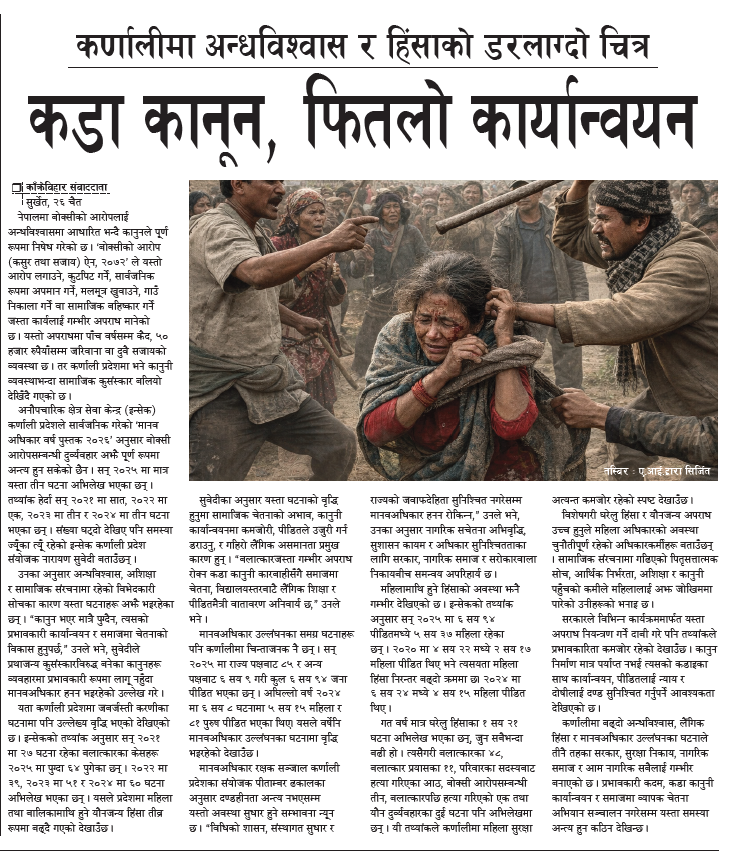 सुर्खेत । नेपालमा बोक्सीको आरोपलाई अन्धविश्वासमा आधारित भन्दै कानुनले पूर्ण रूपमा निषेध गरेको छ । ‘बोक्सीको आरोप (कसुर तथा सजाय) ऐन, २०७२’ ले यस्तो आरोप लगाउने, कुटपिट गर्ने, सार्वजनिक रूपमा अपमान गर्ने, मलमूत्र खुवाउने, गाउँ निकाला गर्ने वा सामाजिक बहिष्कार गर्ने जस्ता कार्यलाई गम्भीर अपराध मानेको छ । यस्तो अपराधमा पाँच वर्षसम्म कैद, ५० हजार रुपैयाँसम्म जरिवाना वा दुवै सजायको व्यवस्था छ । तर कर्णाली प्रदेशमा भने कानुनी व्यवस्थाभन्दा सामाजिक कुसंस्कार बलियो देखिँदै गएको छ ।