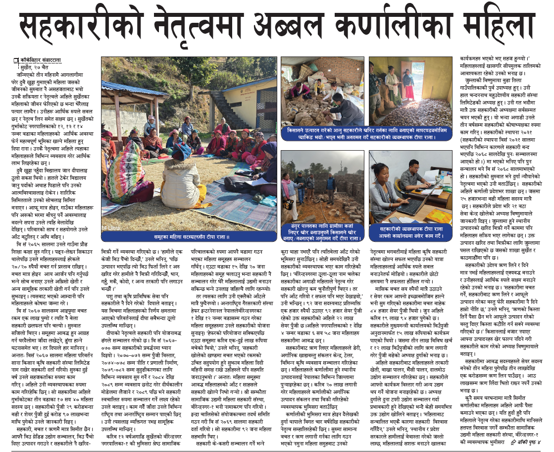मा भएको भनिए पनि पुन सन्चालन भने वि सं २०६८ सालमाभएको हो । सहकारीको सुरुवात भने दुर्गा न्यौपानेको नेतृत्वमा भएको उनी बताउँछिन् । सहकारीको अहिले कर्णाली प्रदेशभर शाखा छन् । जसमा २५ हजारभन्दा बढी महिला सदस्य मात्रै छन् ।