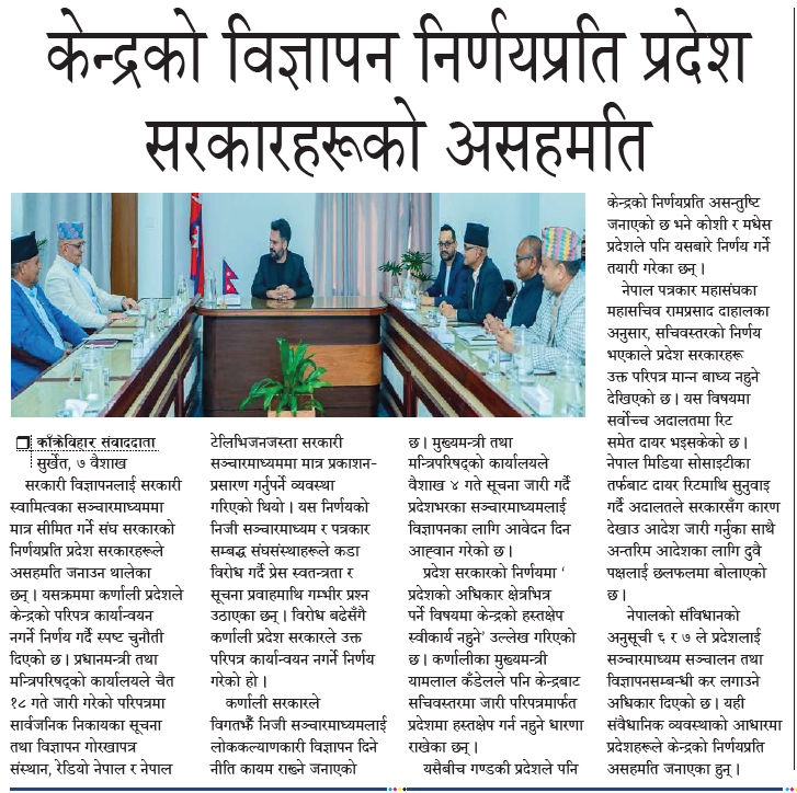 सुर्खेत । सरकारी विज्ञापनलाई सरकारी स्वामित्वका सञ्चारमाध्यममा मात्र सीमित गर्ने संघ सरकारको निर्णयप्रति प्रदेश सरकारहरूले असहमति जनाउन थालेका छन् । यसक्रममा कर्णाली प्रदेशले केन्द्रको परिपत्र कार्यान्वयन नगर्ने निर्णय गर्दै स्पष्ट चुनौती दिएको छ ।