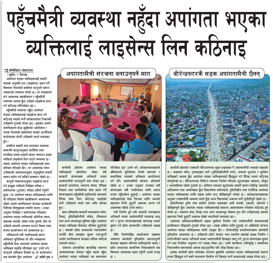 ‘संविधानले सबै नागरिकलाई समान अधिकार सुनिश्चित गरे पनि व्यवहारमा पहुँचमैत्री सेवा अभावले अपांगता भएका व्यक्तिहरू पछाडि परिरहेका छन्’ उनले भने, ‘कानूनले अधिकार दिएको छ, तर कार्यान्वयन पक्ष कमजोर हुँदा अपांगता भएका व्यक्तिहरू लाइसेन्स लिनबाट वञ्चित भइरहेका छन् ।’