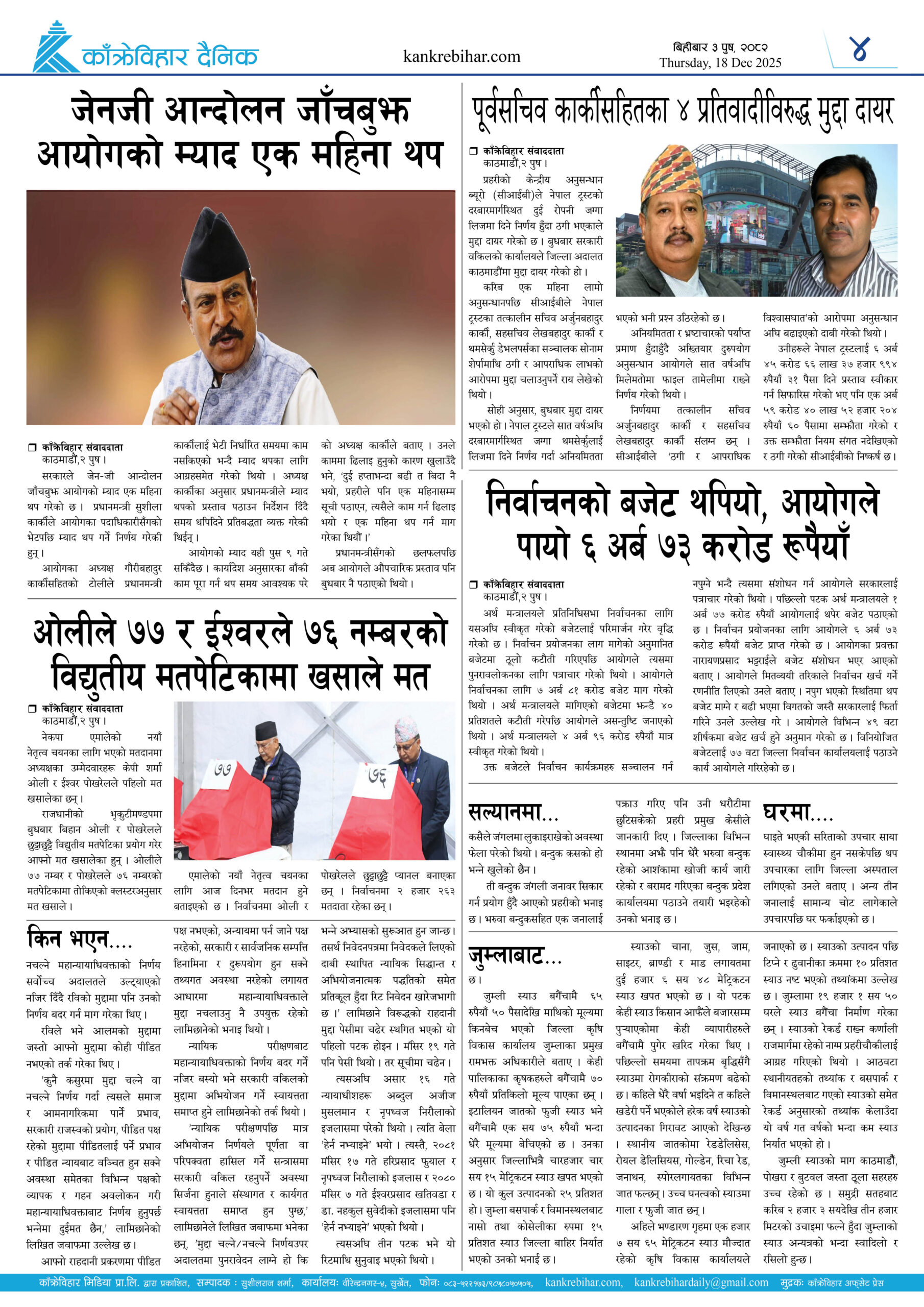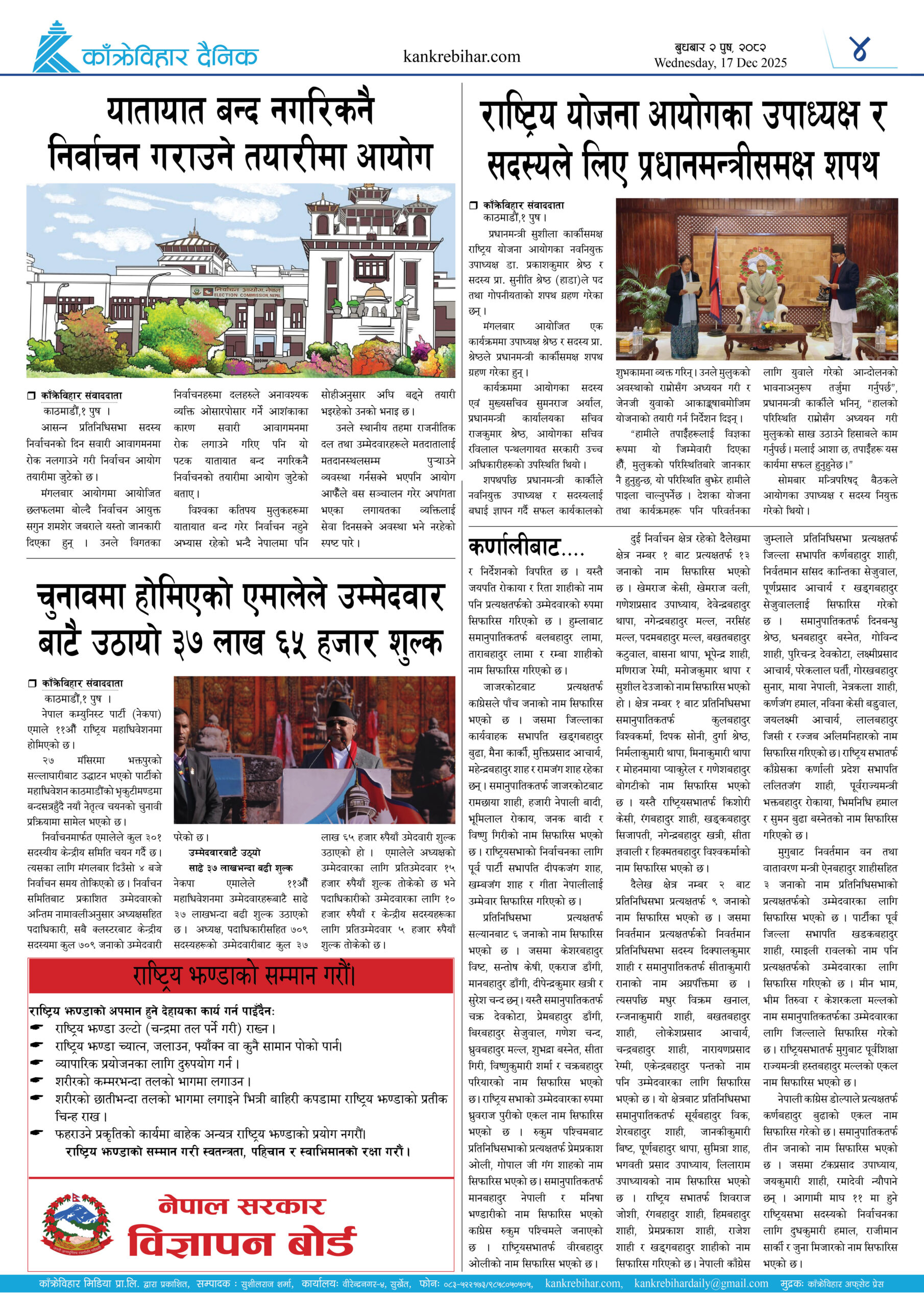 सरकारले घोषणा गरेको प्रतिनिधिसभाको निर्वाचन आउन ७९ दिन बाँकी छन् । निर्वाचनका लागि निर्वाचन आयोगले प्रत्यक्ष र समानुपातिकतर्फको दल दर्ताको प्रक्रिया सम्पन्न गरिसकेको छ । सरकारले पनि निर्वाचनको आवश्यक तयारी तिव्र पारेको छ । निर्वाचन आयोगले निर्वाचन आचारसंहिताको मस्यौदा तयार पारेर आवश्यक सुझाव सङ्कलन गरिरहेको छ । निर्वाचनकै लागि सरकारले सेना परिचालनको स्वीकृतिसमेत पाइसकेको छ । शान्ति सुरक्षा कायम गर्दै स्वतन्त्र, निष्पक्ष र भयरहित वातावरणमा निर्वाचन सम्पन्न गराउन आवश्यक तयारी भईरहेको सरकारले बेलाबेला भनिरहेको छ ।